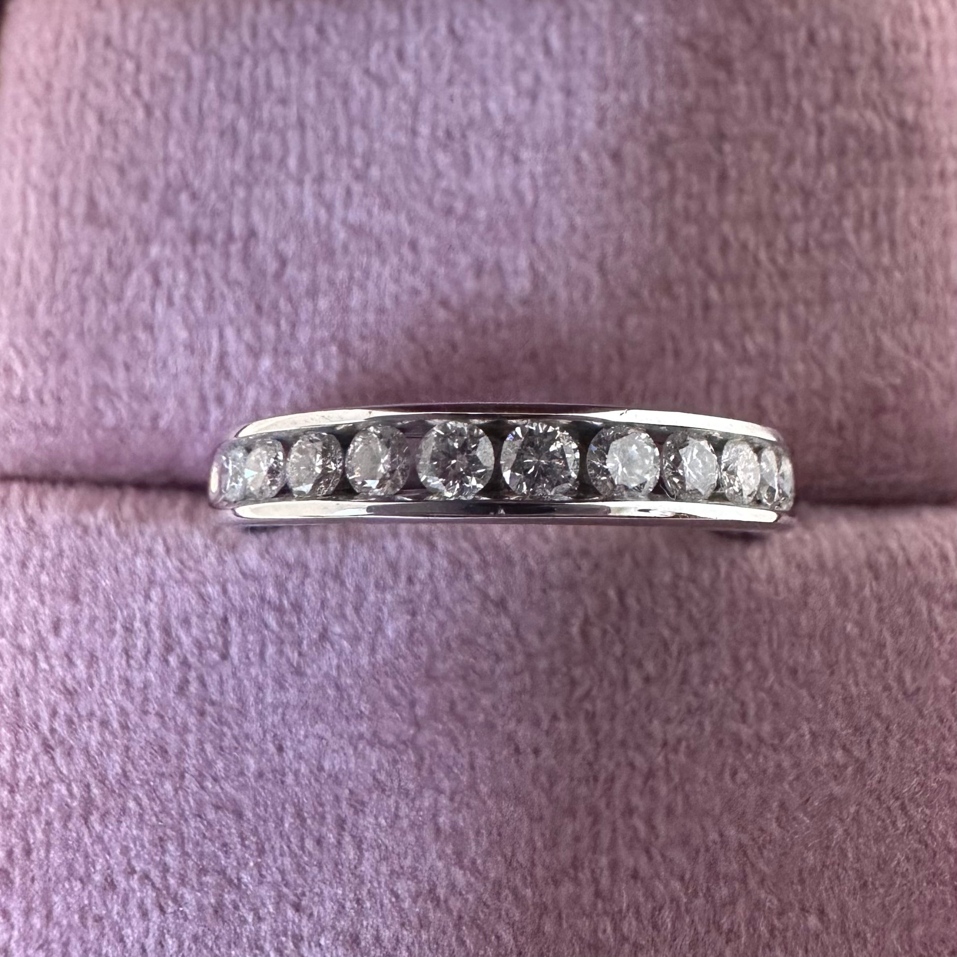 Channel set diamond eternity style band made in 18ct white gold.