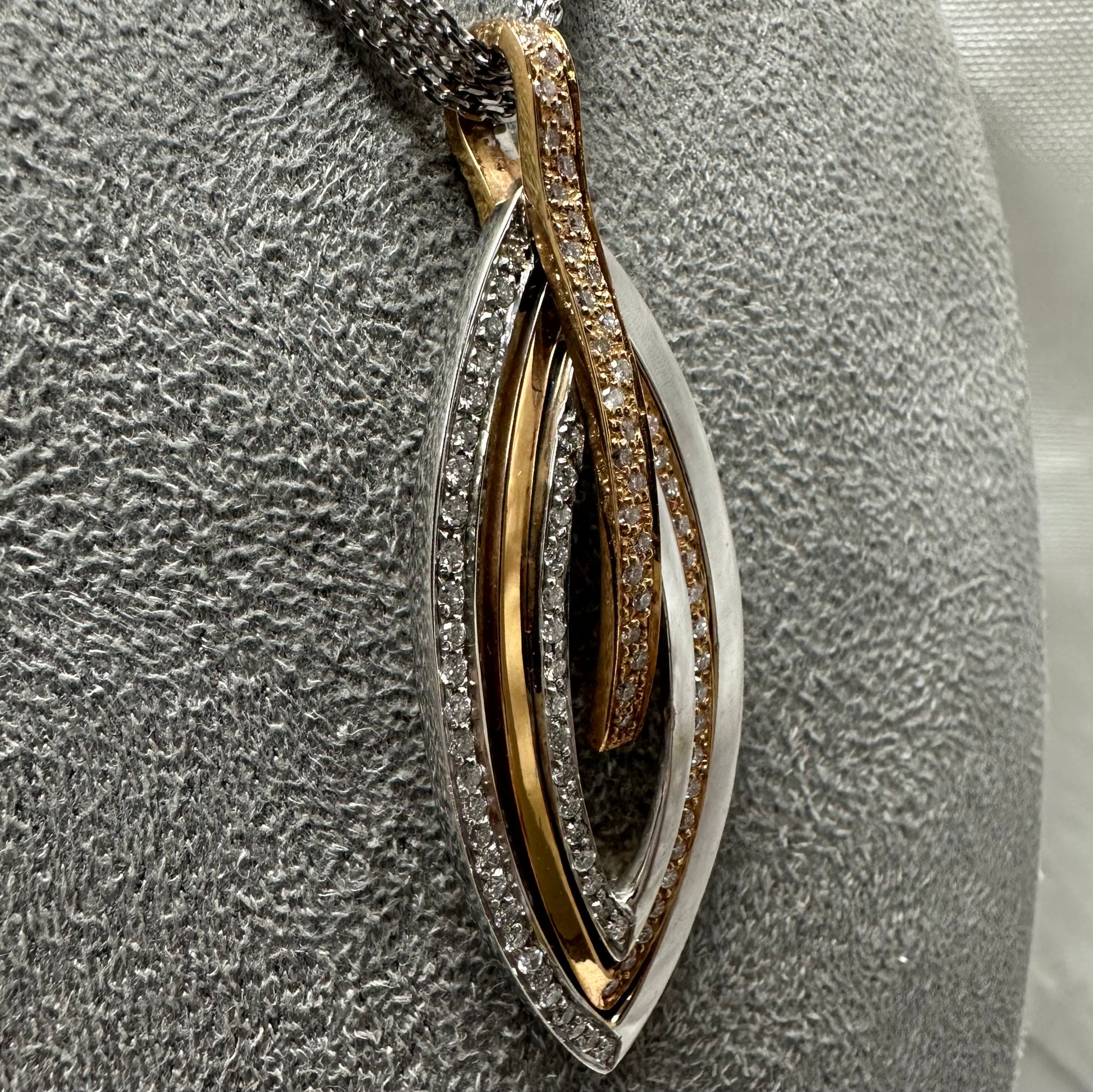 Exceptional ‘one off’ marquise shape diamond set pendant made in 3 colour 18ct gold filled with round brilliant cut diamonds.