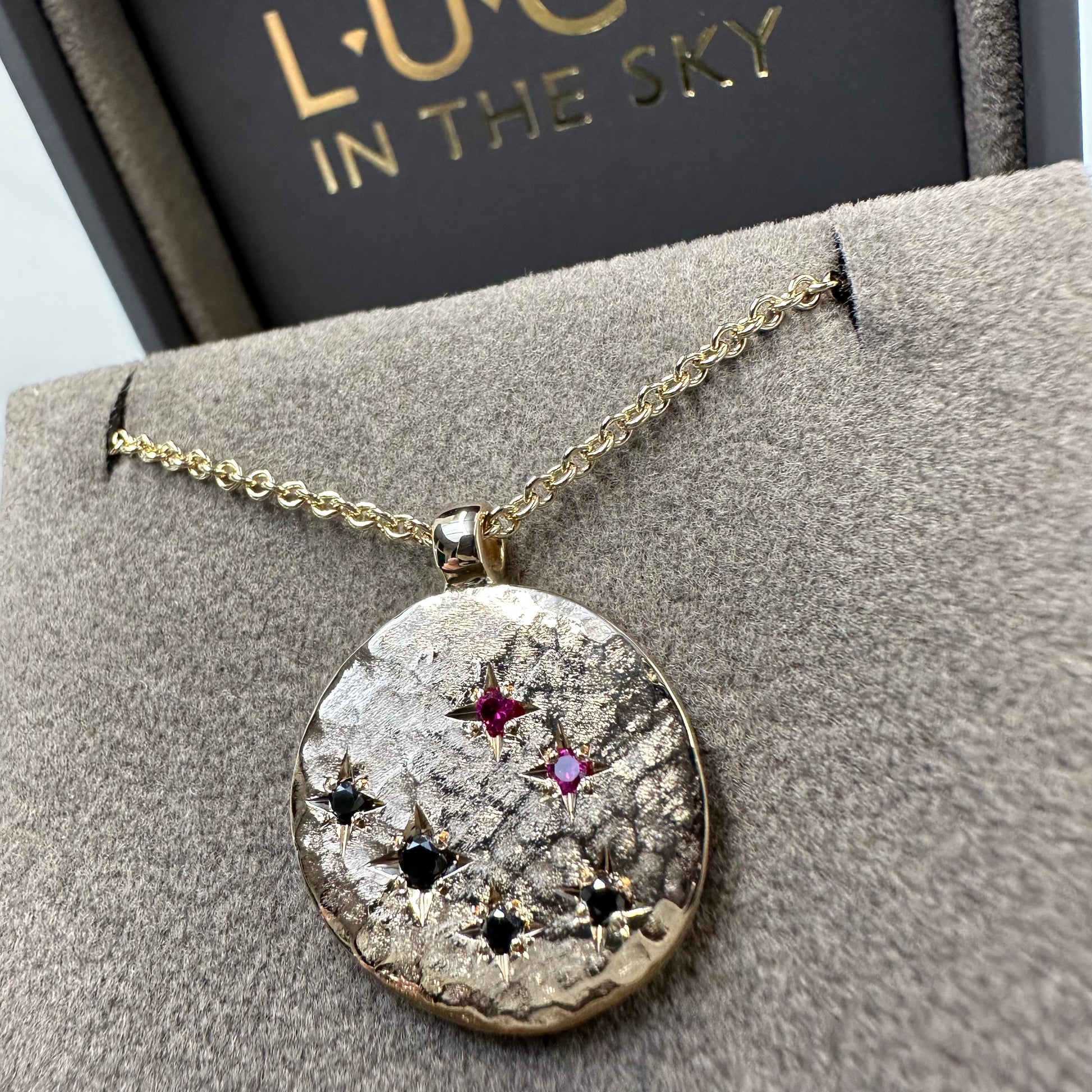 Handmade using recycled 9ct yellow gold and star set with rubies and black diamonds injecting colour and sparkle.