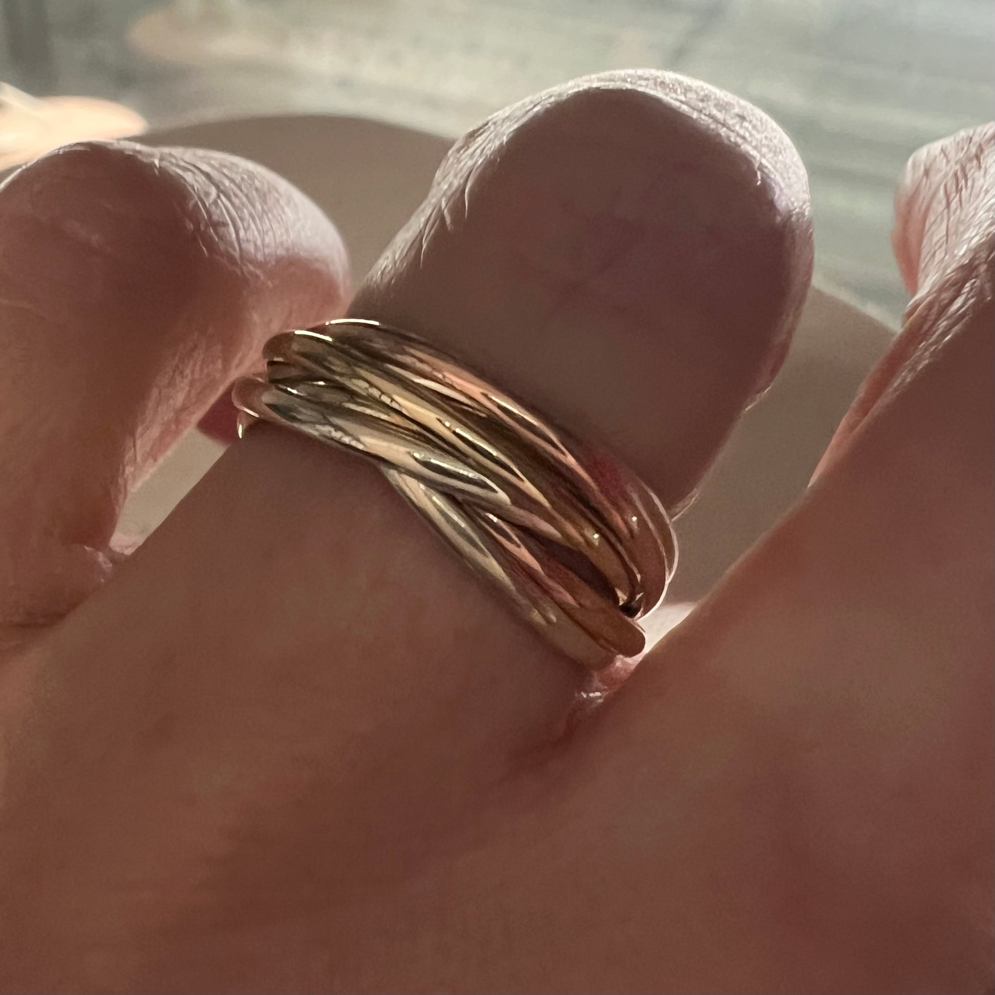 The perfect dress ring for everyday in 3 colour 9ct gold. Finger size M and weighs 4.4g.